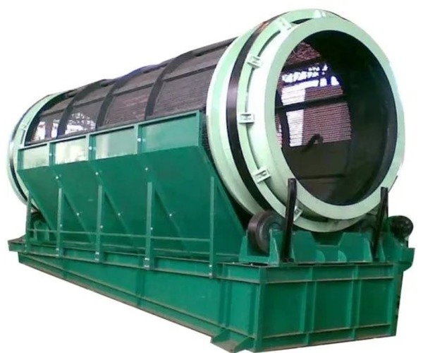 A trommel designed for screening and separating materials in various industries. These machines feature rotating drums with perforated screens that sort materials based on size, making them ideal for waste management, mining, and composting applications where efficient sorting and processing are essential.